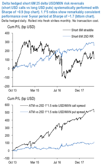 Directional 1*2 ratio call spreads and RKO calls: As an equivalent directional expression for those who want to stay short MXN peso 1*2 ratio USDMXN naked (not delta- hedged) call spreads have returned a Sharpe of 1.85 over the past 5-yrs. The trade has a large left tail risk, being exposed to large drops in the peso. USDMXN call RKOs are another expression worth considering, as they efficiently fade rich skews. The structure would benefit from well behaved and contained spot action, but most importantly it carries well defined downside risk (namely, the premium paid).