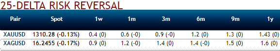 We recommend buying delta-hedged 3M XAUUSD 25-delta risk reversals @ 1.3/1.6 vol.
