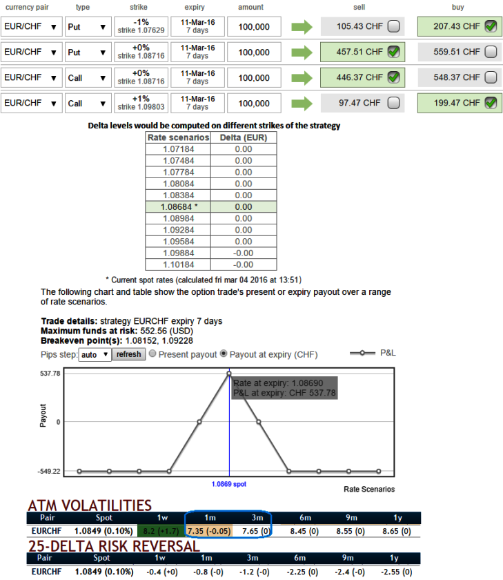 A delta neutral trading strategy in this case involves the buying of a theoretically underpriced option (OTM as shown in the diagram) while taking an opposite position in EURCHF options.