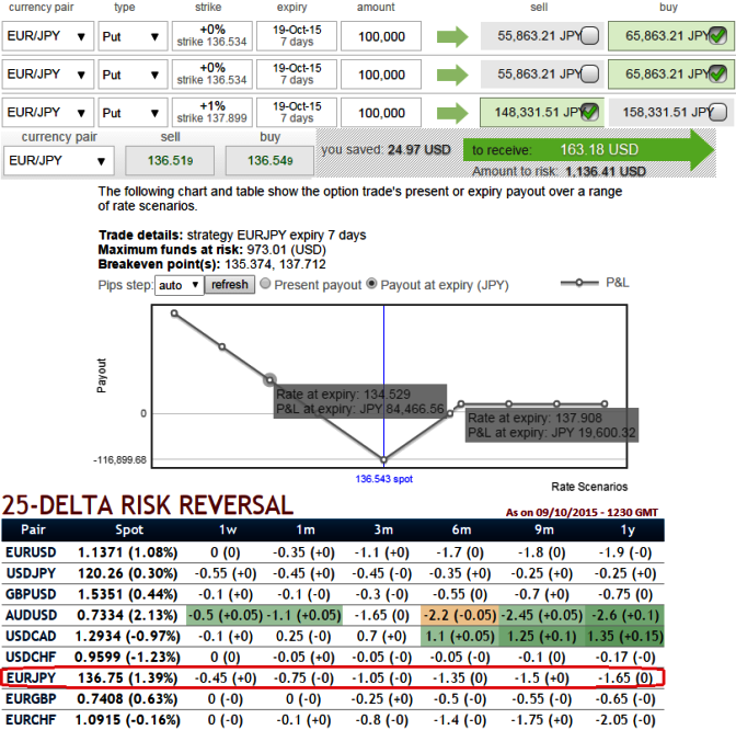 Since the option you sell will always be lower on the skew curve it means you are getting a better deal on what you are selling compared to what you are buying. It makes this strategy a good one if the skew is running a little hot but EURJPY hasn't rolled over that much.