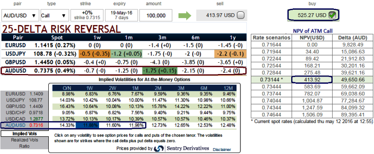 OTC IVs and sensitivity table, we consider 1M ATM IVs at 12.00% at spot FX 0.7332 levels which is still the highest among G10 currency pool and 11.89% for 1W tenors.