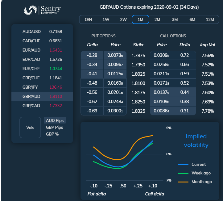 The execution: Initiate long in GBPAUD 3m at the money delta call, long 6m at the money delta put and simultaneously, Short theta in 1m (+1.5%) out of the money put with positive theta or closer to zero (spot reference: 1.8193 level).