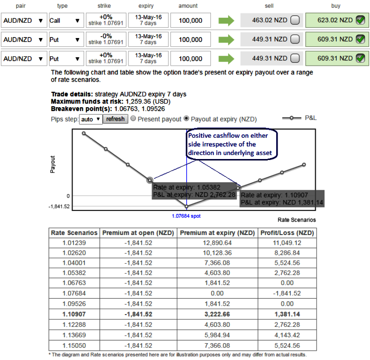 Huge profits achievable with the strip strategy when AUDNZD exchange rate makes a strong move either upwards or downwards at expiration, with greater gains to be made with a downward move.
