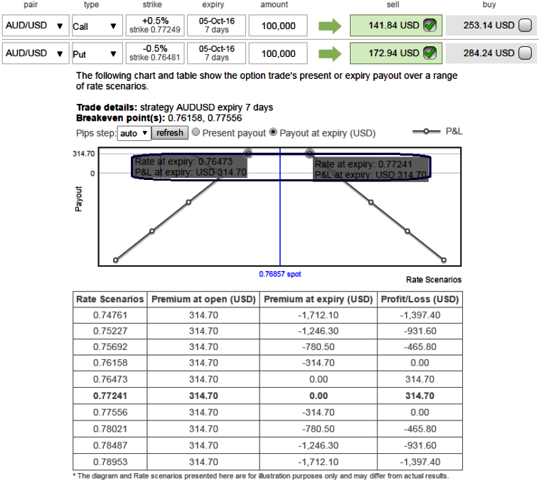 While going long in spot FX of AUDUSD of same outrights, the cost of going long in the spot would be almost equivalent to that of premiums received from writing options from two legs.