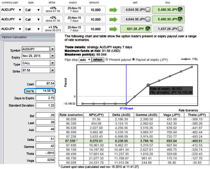 The current IV of AUDJPY ATM call is higher side at 14.58% which is good for writers, usually if the Vega of a long option position is positive and the implied volatility rises or dips, the above stated option prices are directly proportional to the implied volatility.