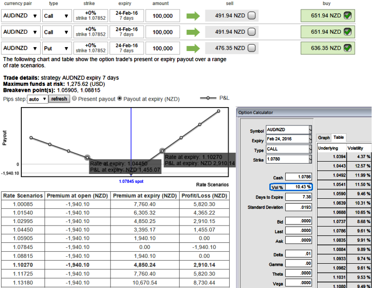 Hence, this AUDNZD option straps strategy should take care of any abrupt downswings in short term and certain upswings and yields handsome returns in long term. Delta of far OTM options is very small which is why we've chosen ATM instrument on call. A 1-point movement in underling pair will not have much effect on the option premium.