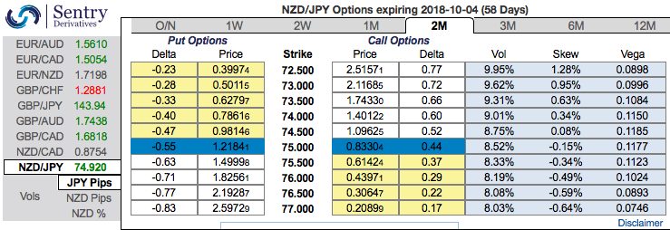 To substantiate this bearish stance, the 2m positively skewed implied volatility indicates the hedging sentiments for the lingering bearish risks. Bids are for OTM puts upto 72.5levels. As a result, we construct suitable options strategy favoring slightly on bearish side. Initiate 2 lots of 2m longs in -0.49 delta put options, simultaneously, add 1 lot of 0.51 delta call options of the similar expiry, the strategy is executed at net debit.