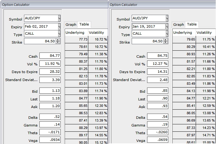 Since, the slumps are likely in near term and upswings in near term seem to be dubious as per the signals generated by technicals as well as from IV skews, AUDJPY option straps strategy should take care of both upswings and downswings simultaneously, even if the BoJ surprises with the forecasters, and the strategy is likely to derive handsome returns on the upside and certain yields regardless of swings on either side but with more potential on upside.