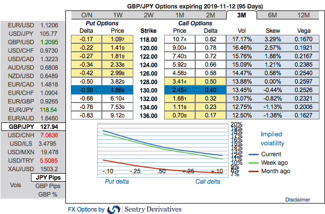 UK Q2 GDP growth having been side-lined for a few days, some intra-day volatility was injected back into GBP after an FT report suggested that PM Johnson is likely to hold a general election in the “days after” Brexit (currently scheduled for 31st October). Implied volatility in GBP pairs have only moved marginally higher but was already trading at their most elevated since January.