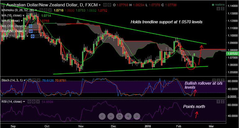 AUD/NZD has taken rising trendline support at 1.0570 levels and edged higher on Friday's trade.