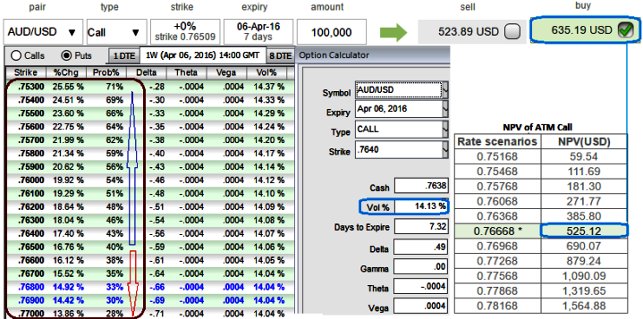 Go long in AUDUSD 1W at the money -0.49 delta put, go long 1M at the money +0.50 delta call and simultaneously, Short 1W (1%) out of the money call with positive theta or closer to zero.