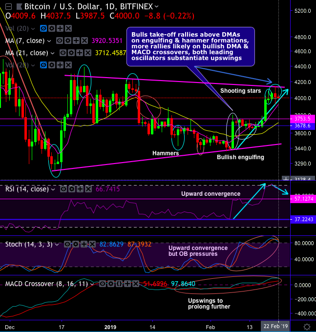 Bitcoin price extended its recent rallies after it broke-out decisively the resistance zone of $3,675 - $3,750 mark against the US Dollar. BTCUSD forms spinning top at $4,008.80 levels to hamper previous bullish momentum. The price of this pair has surpassed $4k mark to extend bullish streaks yesterday and hit 6-weeks highs (refer daily chart). In this process, the minor trend of this pair has formed a wedge pattern, although the current price spikes above 7-DMAs with bullish crossovers, failure swings are observed at wedge resistance.