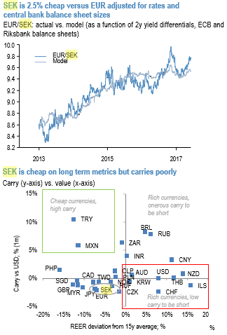 SEK continues to screen cheap on multiple metrics. It currently appears 2.5% or 1.7 sigma too cheap vs EUR adjusted for rates and balance sheet differentials (refer above chart). SEK also looks modestly cheap on long-term value metrics as well with REER 7% below 15y averages.