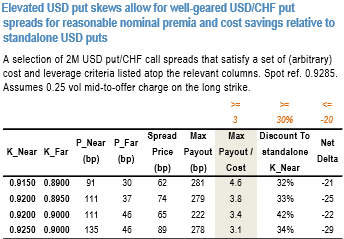 At current market (spot ref. 0.9250), a 2M USDCHF put 0.92 /0.90 USD put/CHF call spread costs 65bp, offers 3.4x max gearing and 40%+ cost savings relative to the standalone 0.92 strike vanilla call (refer above nutshell for a selection of USDCHF put spreads with decent optics).