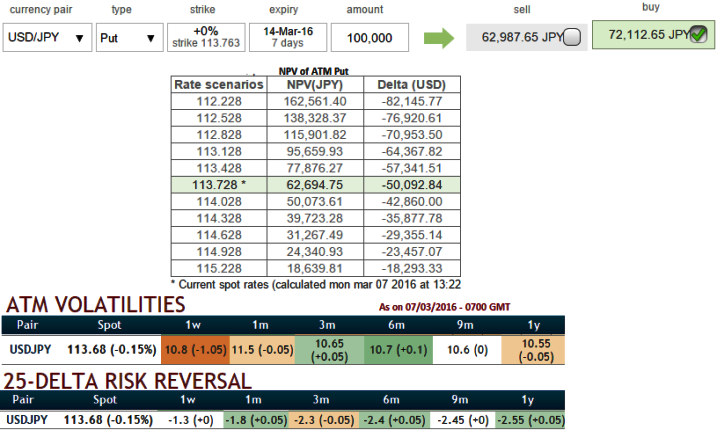 NPV of 1w ATM put of USDJPY is JPY 62,694.74 while premiums trading above 15.02% at JPY for lot size 100,000 units. Thereby, disparity between IVs and option pricing exists.