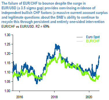 Nevertheless, we suspect that an adverse finding by the UST about currency manipulation in its next report would increase pressure on the SNB to scale back its activities and permit rather more CHF appreciation. While such a finding is not necessarily guaranteed even if Switzerland does now satisfy the three objective criteria to identify manipulation criteria, we continue to regard the forthcoming report as an important asymmetric risk factor for CHF, one that is worth pre-positioning for.
