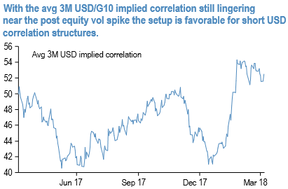 Most notably, aggregate USD-denominated implied correlations still trade near their highs from around the VIX shock (refer above chart) – a set-up that is favorable for betting on the divergence between reserve and high beta currencies via short USD correlation structures. In the recent past, we already initiated a tilt towards correlation selling via triangles of short USDJPY and NZDUSD puts hedged with long NZDJPY puts.