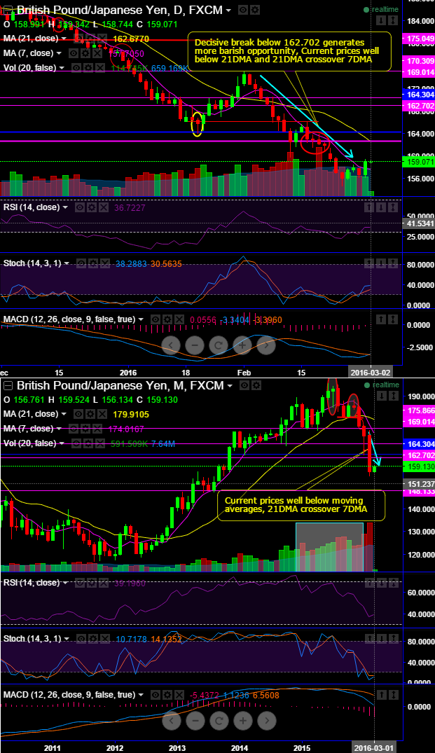 Instead, it is viewed for some more corrections in GBPJPY upon a decisive breach of important supports at 164 and 162 levels on monthly chart, it is now on verge of sliding southwards and can only find strong support at 150s or below (148.133 levels to be precise).