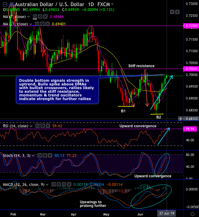 For now, rallies most likely to extend further up to the stiff resistance of 0.7025 levels, while the momentum and trend oscillators indicate strength for further prevailing rallies.