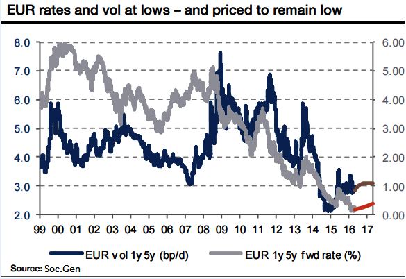 So, both EUR rates and rates volatility are close to historical lows - and priced to remain so (see above chart).