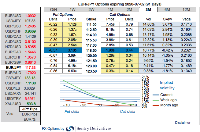 OTC Outlook: Most importantly, the positively skewed EURJPY IVs of 3m tenors are also signifying the bearish risks in the underlying spot (refer 1st exhibit). The bids for OTM puts indicates that the hedgers expect the underlying spot FX to show further dips so that OTM instruments would expire in-the-money (bids up to 111 levels).