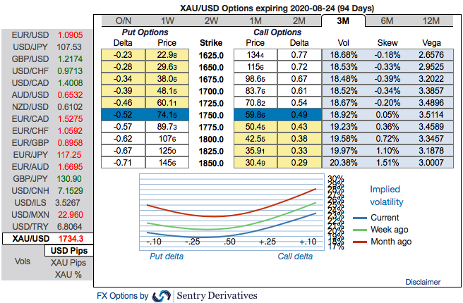 The 3m positive skewness of gold options contracts implies more demand for calls (refer 1st chart). These skewed IVs of 3m XAUUSD contracts are still indicating the upside risks, bids for OTM call strikes up to $1,850 is quite evident that reminds us hedgers’ inclination for the upside risks.