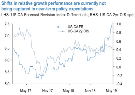 The US relative growth outperformance comparatively persisting, but it would appear that this growth differential is currently being somewhat discounted in rates markets (refer 1st chart). Should this relative outperformance continue, a re-widening of US- CA spreads may be justified, and would be supportive of USDCAD higher.