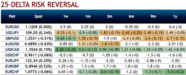 EUR risk reversals have still been indicating the hedging sentiments for the bearish risks in the long run, as the fresh negative bids are added to the positive RRs for 1-3m tenors.