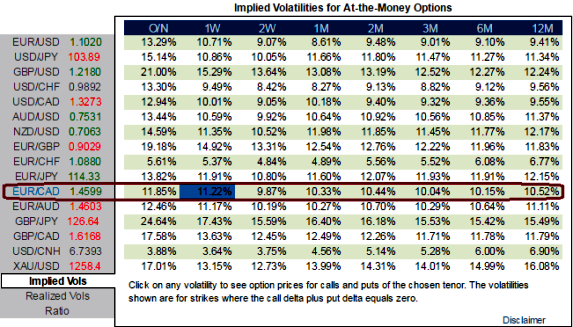 Alternatively, using any abrupt rallies, you decide to initiate a diagonal debit/bear put spread (DDPS) at net debit 1w ATM IVs of EURCAD is just shy above 11.20%, and likely to spike higher 10% in 1-3m tenor.