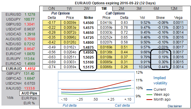 OTC outlook:As a resultant effect of fundamental developments as discussed above, the sentiments in OTC market for EURAUD have been notably changing, you can probably make out 1w IVs skews creeping up in positive numbers and IVs rise just shy above 10% for this expiry. This indication means there is more bets on EUR calls and AUD puts as the OTC market sentiments are more concerned about the underlying spot may shift towards OTM calls strikes on expiration.