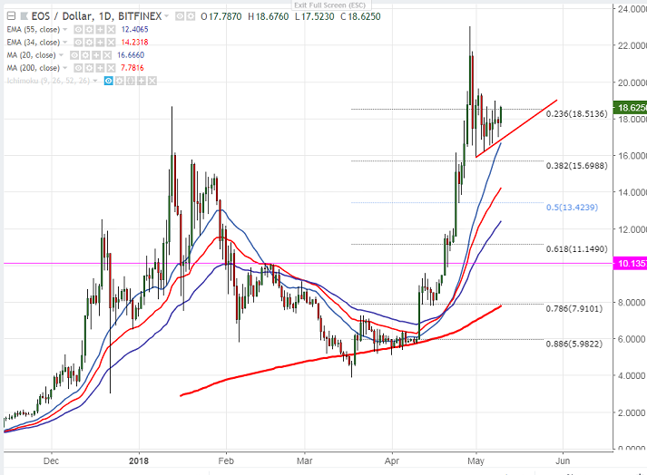 - EOS/USD has jumped sharply almost more than 350% and managed to take over Litecoin’s market cap. EOS has released EOS Dawn 3.0 in form of test net and EOS Dawn 4.0 released on May 4th. It is main reason for sudden jump in EOS prices. The launching of EOSIO main net scheduled for May 11th 2018. It is consolidating between $15.91 and $19.63 for past ten trading session. The pair hits life time high of $23.02 on Apr 29th 2018 and shown a minor profit booking. It has recovered more than 450% from temporary bottom of $3.8700 and is currently trading around $18.61.