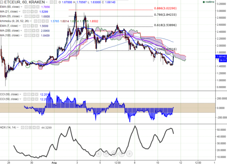 ETC/EUR has broken major support 1.5400 and declined till 1.42300 levels (KRAKEN). It is currently trading around 1.69970 at the time of writing.