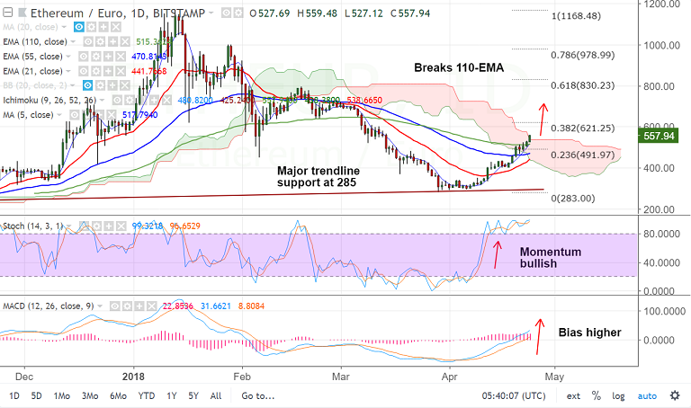 - ETH/EUR has shown a decisive break above 110-EMA at 515 levels, bias higher.