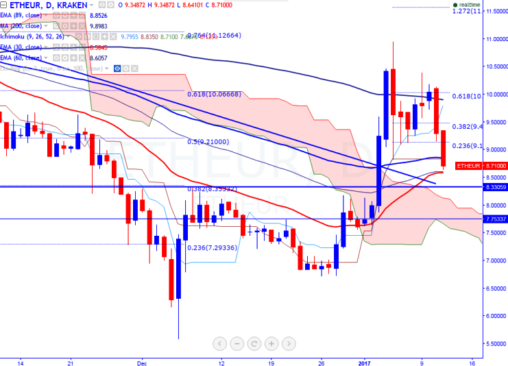 ETH/EUR is seen trading well below on Thursday. The pair has declined sharply after jumping till 10.14 yesterday (KRAKEN). It is currently trading at 8.68 at the time of writing.