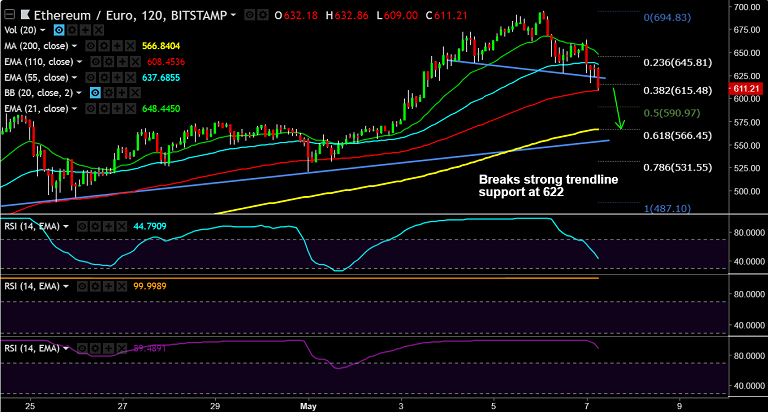 - ETH/EUR has broken strong trendline support at 622, holds above 2H 110-EMA at 608 levels.