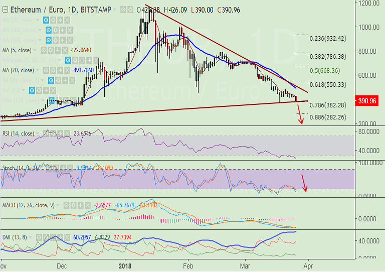 - ETH/EUR down 4.15% on the day, remains capped at 5-DMA at 425 levels.