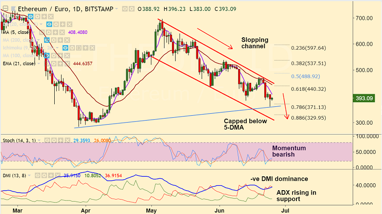 - Technical indicators are biased lower, we see scope for further weakness on break below strong trendline support at 360 levels.