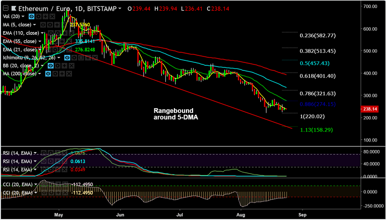 - ETH/EUR is trading in an extremely narrow range around 5-DMA at 237 levels.