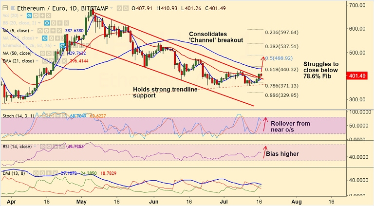 - ETH/EUR consolidates break above channel top, bias higher.