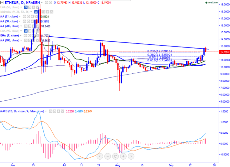 ETH/EUR has broken trend line resistance 12.65 and jumped till 12.849 yesterday (KRAKEN). ETH/EUR pared its gain from the high on Wednesday. It is currently trading around 12.17 at the time of writing.