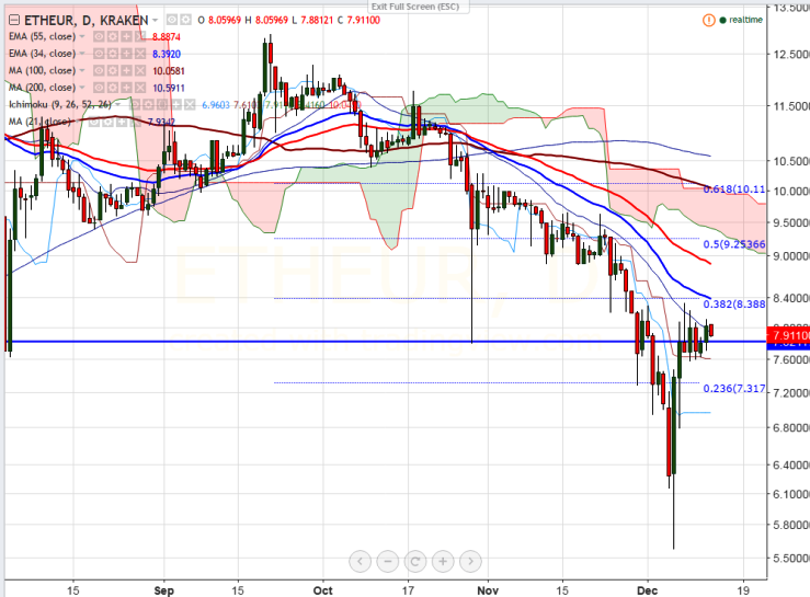 ETH/EUR is seen trading low on Tuesday. The pair has formed a short term bottom around 7.60 and slightly recovering from that level (KRAKEN). It is currently trading around 7.910 at the time of writing.
