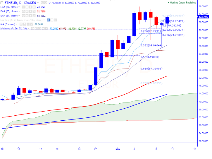 ETH/EUR pair recovered sharply after hitting low of 67.25 yesterday (KRAKEN). ETHEUR has shown a huger rally till 83 and is currently trading around 82.90 at press time.
