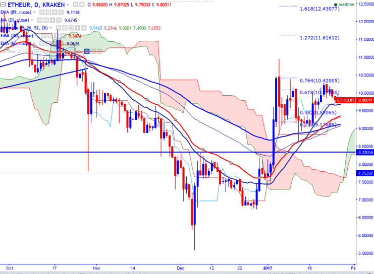 ETH/EUR is seen trading slightly below in red on Friday. The pair has shown a slight recovery till 9.99 from the low of 9.72 made on 25th Jan 2017 (KRAKEN). It is currently trading at 9.80 at the time of writing.