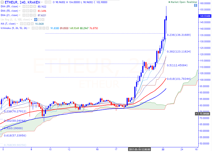 ETH/EUR pair has broken major psychological resistance at 100 and hits fresh all-time high at 158. ETH/EUR trading stronger and a minor weakness only below 136 level (KRAKEN). It is currently trading around 148.95 at press time.
