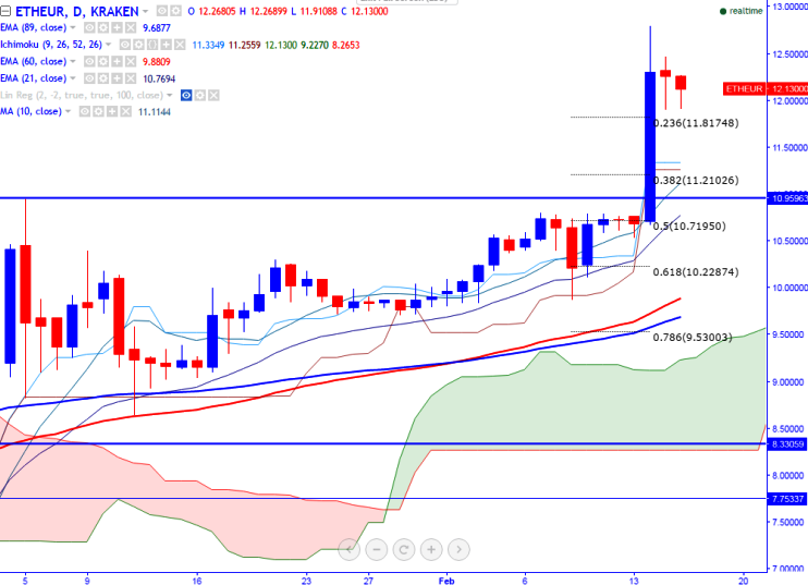 ETH/EUR is seen trading slightly below on Thursday after trading high. The pair has formed a temporary top around 12.799 and declined slightly from that level (KRAKEN). It is currently trading at 12.18 at the time of writing.
