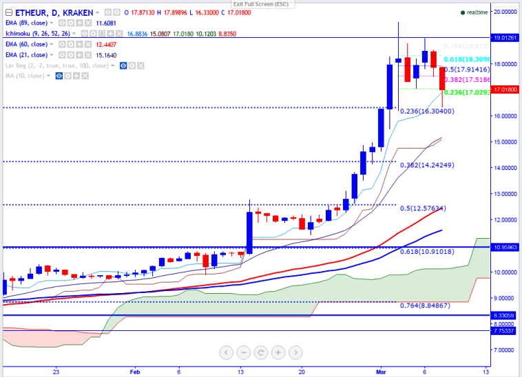ETH/EUR is seen trading slightly below on Wednesday and the pair has declined sharply after making high around 19.62 on Mar 3rd, 2017 (KRAKEN). Short term trend is extremely bullish as long as support 16.30 (23.6% retracement of 5.58 and 19.62) holds. It is currently trading around 17.05 at the time of writing.