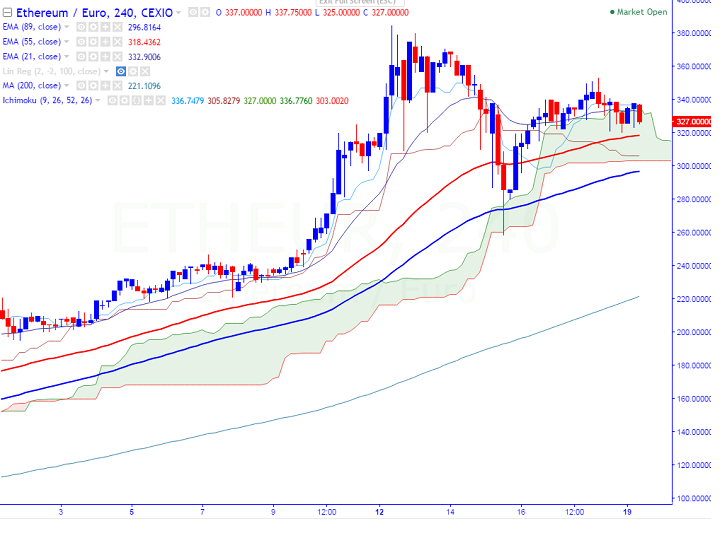 ETH/EUR is consolidating in narrow range between 353 and 320 for the past three trading sessions (KRAKEN). The pair formed a temporary top around 385 and is currently trading around 311.00 at the time of writing.