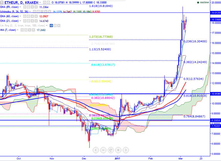 ETH/EUR pair has shown a slight profit booking after hitting fresh all time high at 19.62 (KRAKEN). Short term trend is extremely bbullish as long as support 16.30 (23.6% retracement of 5.58 and 19.62) holds. It is currently trading around 18.25 at the time of writing.