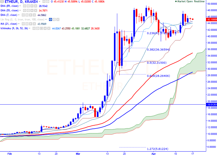 ETH/EUR is seen trading slightly below in red on Monday and the pair jumped till 47.80 after forming a minor bottom at 38.40 on Apr 4th, 2017 (KRAKEN). It is currently trading around 45.17 at the time of writing.