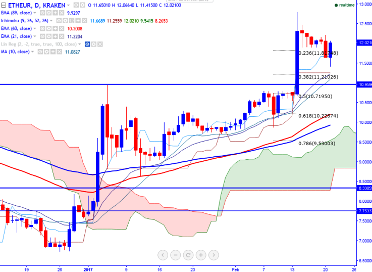 ETH/EUR is seen trading slightly above on Tuesday. The pair recovered sharply after declining till 11.415 yesterday (KRAKEN). It is currently trading at 12.04 at the time of writing.